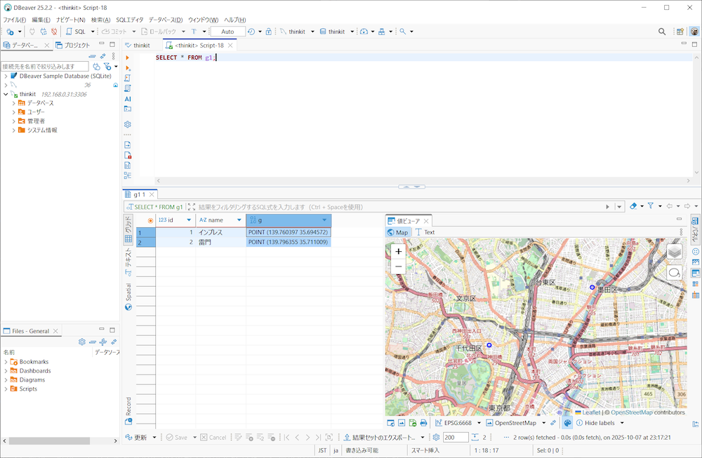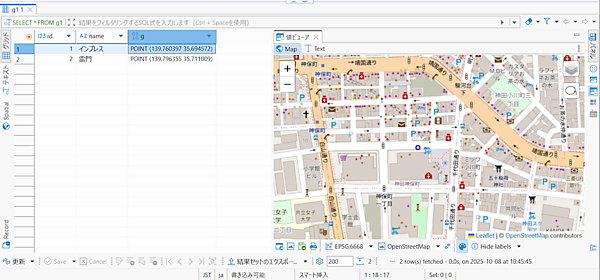 実行結果には、SELECT文の結果である2件のid列、name列、g列の値が表示されています。g列に前回登録したPOINTの情報が含まれていることが分かりますね。ここで「id=1 インプレス」のg列の枠をクリックしてみます。“POINT (139.760397 35.694572)”と表示されている部分です。クリックすると右側の「値ビューワ」に地図が表示され、このポイントの位置が青い丸で示されます。