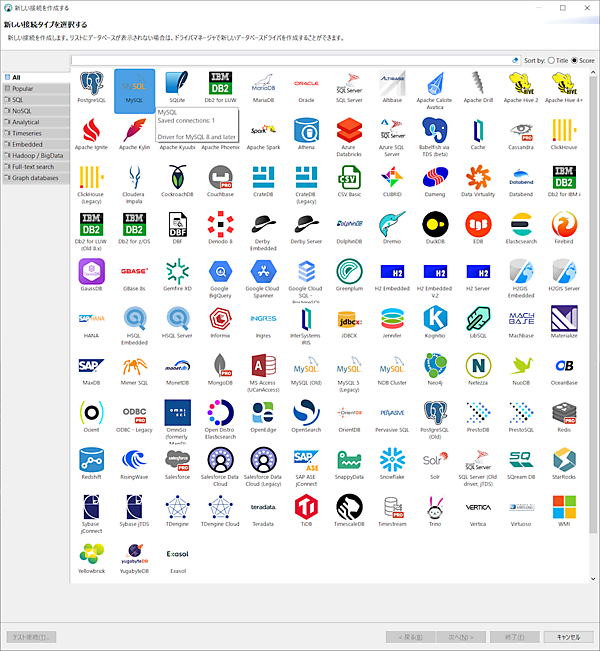 - DBeaverは多くのデータベースへの接続に対応しています。データベースを選択する画面を見ると「DuckDB」や「TiDB」といった比較的新しいデータベースに対応していることからも、開発の活発さが伺えますね。ここでは“MySQL”を選択します。