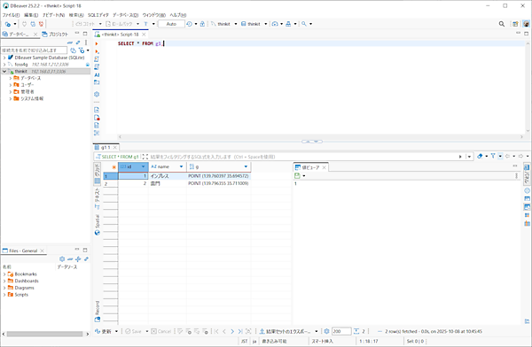勘の鋭い方は、今回紹介したSQLの結果に違和感を持ったことと思います。前回コマンドラインで同じSQL文を実行した際、g列はバイナリで結果を得ていたはずです(それ自体も本来のバイナリからHEX表現へと「変換」されているとも言えるのですが)。POINT情報として結果を得るためにST_AsText()関数を使用しましたね。それが、今回のDBeaverの結果ではいきなりPOINTデータの数字として画面上で確認できています。これこそが「DBeaverの便利なポイント」でもあり、ここで自動変換が行われていることを知らないまま使っている人にとっては「本来の結果ではないものを見てしまっている」という側面なのです。
