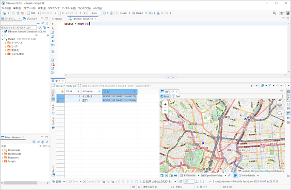 DBeaverには様々な機能がありますが、今回はとにかく「データ内容を地図上で見ることができる」という点に注目して説明を進めます。まず、SQLを実行して、その結果を確認する手順を確認しましょう。