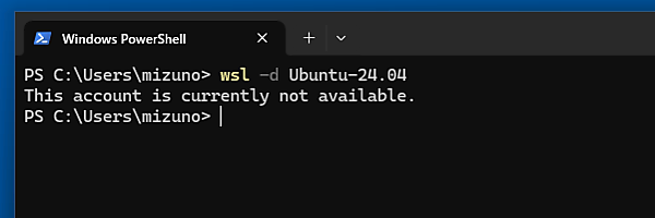 $ sudo usermod -s /usr/sbin/nologin mizunoコマンドを実行したら、一度WSLからログアウトし、再度ログインを試みてみましょう。ログインシェルに「/usr/sbin/nologin」が設定されている場合は所定のメッセージが表示された後、ただちにログイン処理は終了します。いわゆる「やらかしてしまった」状態ですね。