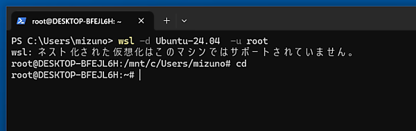 ところが、これはそれほど大した問題ではありません。というのも、特定のユーザーの設定がおかしくなっているだけであれば、別ユーザーでログインすることでバイパス可能だからです。WSLは起動時に「-u」オプションでログインするユーザーを指定できます。例えば、以下のコマンドを実行すればrootユーザーとしてUbuntu-24.04にログインできるのです。