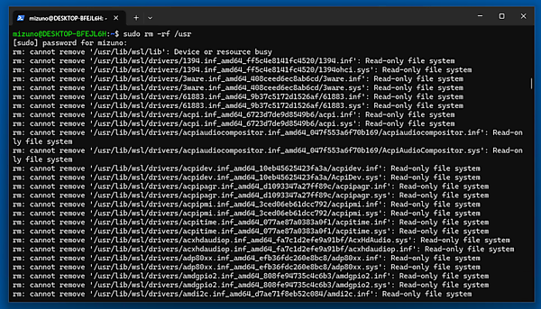 前述の通り、WSLが起動さえしていれば、なんとでもやりようはあります。本格的にまずいのは、WSLそのものが起動しない状態です。具体的には、ディスク障害や重要なシステムファイルが欠損したなどの理由で、OSそのものが起動に失敗してしまうケースです。それでは、うっかり「sudo rm -rf /usr」コマンドを実行し、OSの起動に必要なファイルをディレクトリごと消し飛ばしてWSLを起動不能にしてみます。