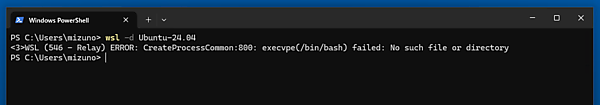 - WSL2は正しく起動しているが、ユーザーレベルの設定の問題でログインできない状態