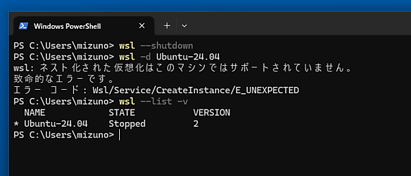 PowerShellから一度WSLをシャットダウンし、再起動してみましょう。致命的なエラーで起動に失敗します。