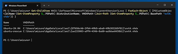 実行すると、下図のようにインストールされているWSLディストリビューションごとにvhdxファイルのパスが表示されます。先ほど壊したのは「Ubuntu-24.04」なので、このvhdxファイルへのパスを控えておきましょう。