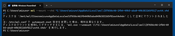 $ wsl --mount --vhd "vhdxへのパス"すると、すべてのWSL内から「/mnt/wsl/(vhdkファイルのパスから特殊文字を除いたもの)」というパスで、このvhdkの中身にアクセスできるようになります。