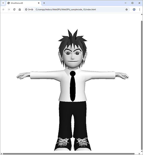 今回は、キャラクターモデルとしてダウンロードした「webgpu.zip」に入っている「models/Character.js」データを使います。まずは「ボーン(骨)」をセットしますが、今回は図1のように初期位置のままでアニメーションはせず、T字ポーズをとるだけです。