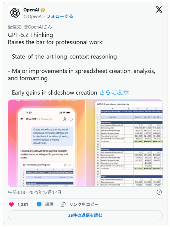 【出典】「OpenAI、最新モデル「GPT-5.2」を発表」(gihyo.jp 2025/12/12)