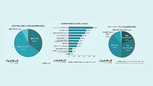 同調査では約36%の企業で「コロナ禍と比較して出社頻度を増加させた」ということが明らかになっています。出社頻度を増加させた理由は「コミュニケーションが希薄になった(46.6%)」が最も多く、次いで「新人教育がしにくい(34.2%)」「従業員の生産性が全体的に低下した(32.1%)」が続きます。