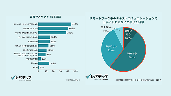 また、リモートワーク中のテキストコミュニケーションについて聞いたところ、現在リモートワークをしているITエンジニアの約6割が「伝えたいことが上手く伝わらない」と感じた経験があると回答しました。リモートワークの継続を希望する人は多い一方で、コミュニケーションの課題も浮き彫りになっています。出社は、これらの課題を解決し、チームの一体感を醸成する上で重要な役割を果たすと考えられます。