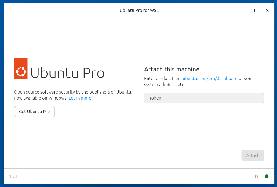 Ubuntu Pro for WSLを起動すると、下図のウィンドウが表示されます。ここにトークンを入力してAttachをクリックしてください。以後、インストールするすべてのUbuntuインスタンスに対し、自動的にUbuntu Proが有効になります。