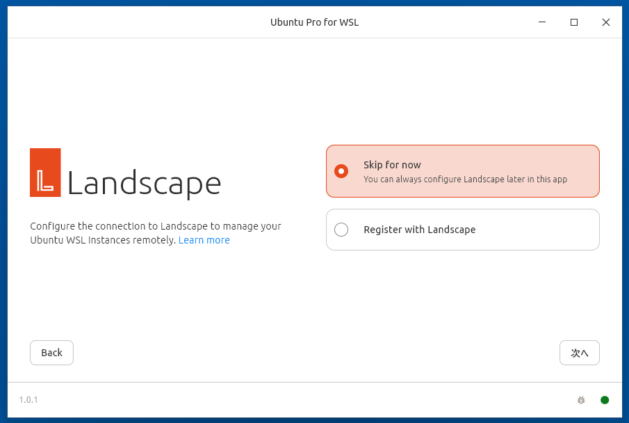 続いて「Landscape」の設定画面が表示されます。LandscapeはUbuntu Proが提供するサービスの1つで、複数のUbuntuマシンをまとめて管理するためのものです。ここではLandscapeは使用しないため、「Skip」を選択して「次へ」をクリックします。