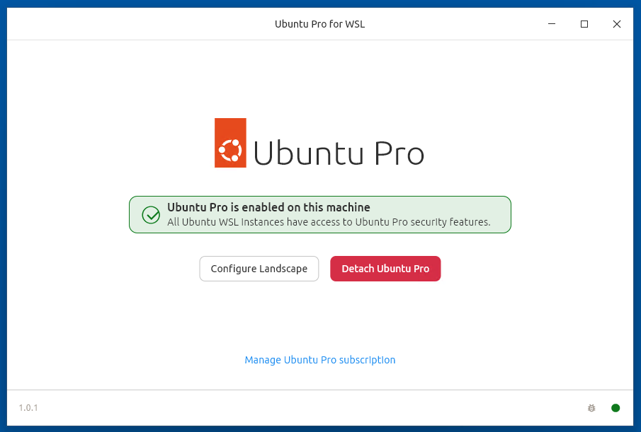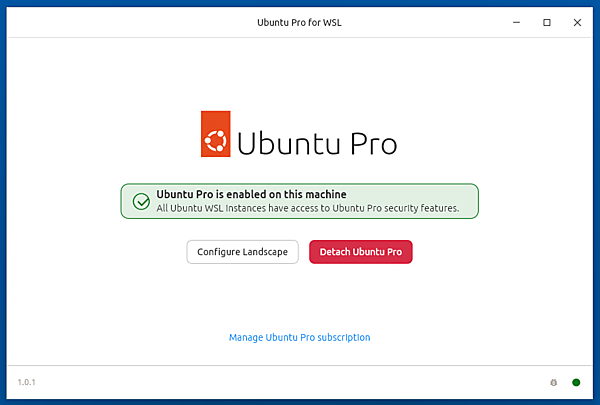 これで、Ubuntu Pro for WSLの設定は完了です。なお、以下の画面で「Detach Ubuntu Pro」をクリックすると、インストールされているすべてのUbuntuインスタンスに対しpro detachが実行されます。