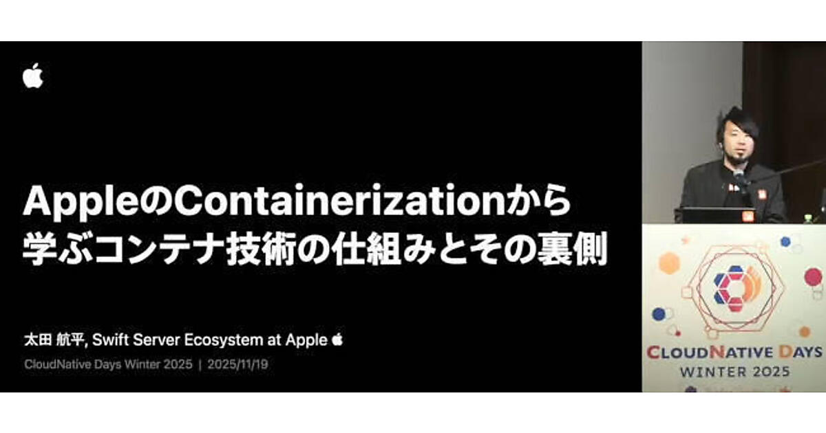 CloudNative Days Winter 2025の「AppleのContainerization Frameworkから学ぶコンテナ技術の仕組みとその裏側」では、Apple Senior Software Engineerの太田航平氏が、Swift製コンテナツールの設計思想とその背後にある技術的選択を解説した。OCIやgRPCを含む関連技術を踏まえつつ、本ツールがCloud Nativeエコシステムでどのような姿を目指すのかが示された。