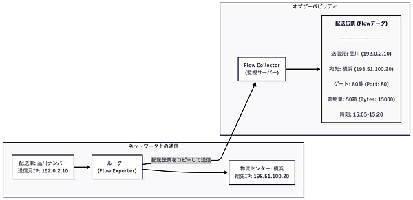 - Flowデータ:「品川ナンバーの配送車(送信元IP)が横浜の物流センター(宛先IP)にある『80番』という指定ゲート(宛先ポート番号)を使い、午後3時5分から15分間、段ボール50箱分の荷物(通信量)を搬入した」という、個別の活動記録が分かる