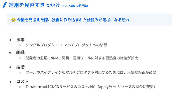 2024年に入り、事業のマルチプロダクト化、開発者の急増、CI/CDパイプラインの修正コスト、Terraformの課金モデル変更など、複数の要因が重なり、ECS基盤の運用を根本から見直す必要が生じた(図1)。