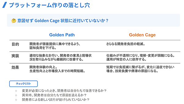 抽象化や自動化の効果は大きい。だが、その内部が複雑化していくと、開発者の試行を妨げ、変化への追従を阻害する“Golden Cage”に近づく危険性もある(図2)。
