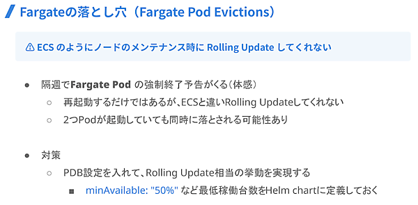 最初に明らかになったのは、Fargateのメンテナンス予告に伴う、ワークロードの強制再起動だ。ECSでは影響が限定的だったが、EKSのFargateではPodの再作成が必ず発生するため、ワークロードによっては業務時間帯に影響が及ぶ懸念があった。これに対し同社は、自動再起動を前提にした設計や冗長化を徹底し、影響範囲を最小限に抑える方針を取った(図5)。
