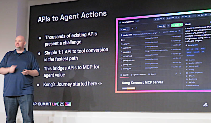 補足的な内容となるが、KongのエンジニアJohn Harris氏が行ったセッションから、2枚のスライドを紹介する。AIとAPIの役割について「AIと既存APIを1対1で接続することが最初のステップ」と訴求していた。既存のAPIが固定的な動作であることに対して、AIがMCPを通じて動的に呼び出されるAPIを管理することで生成AIの時代においてもAPIゲートウェイの役割は変わらないという発想だ。