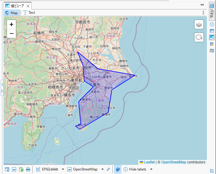これは筆者が住んでいる千葉県の形を、たった12個の点でシンプルにデフォルメした面データを構成するポイントたちです。それぞれの点は緯度・経度の組み合わせで表されています。注目してもらいたいのは、1件目のデータと最後のデータが同じ座標を表しているということです。これらの点を順につなぐことで、線がひとまわりして元の場所に返ってくる、つまり、ぐるりと閉じた領域が表現されます。