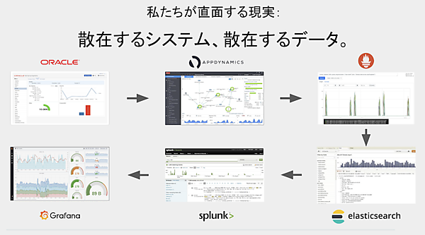 例えば、Oracle Databaseに格納されたデータの場合、Oracleの管理画面だけで完結するとは限らない。必要に応じてAppDynamicsで障害調査を行ったり、ElasticsearchやSplunkでパフォーマンス分析を行ったりと、複数のツールを行き来する必要がある(図1)。