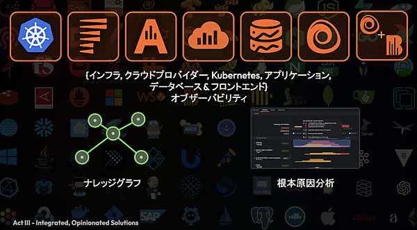 オープンソース版のGrafanaや、個別に提供されるクラウド機能との違いとしては、ナレッジグラフの活用、障害発生時の根本原因分析(RCA)、Kubernetes環境への高度な対応、ユーザーが開発した独自アプリケーションの自動検出、さらにAIエージェントへの対応など、運用を高度化するための機能が含まれている(図4)。