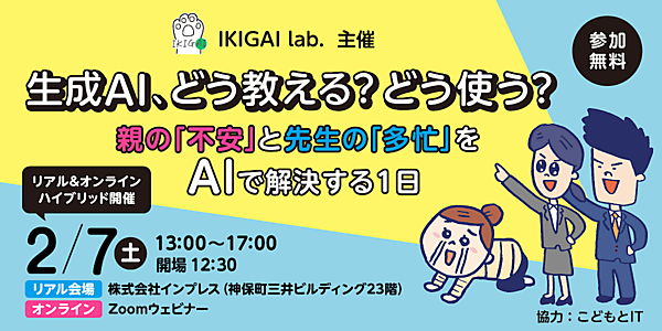IKIGAI lab.、親子と教員向けイベント「生成AI、どう教える?どう使う?」を2月7日に開催 リアル会場とオンラインを同時開催、参加無料で会場は定員100名 - こどもとIT