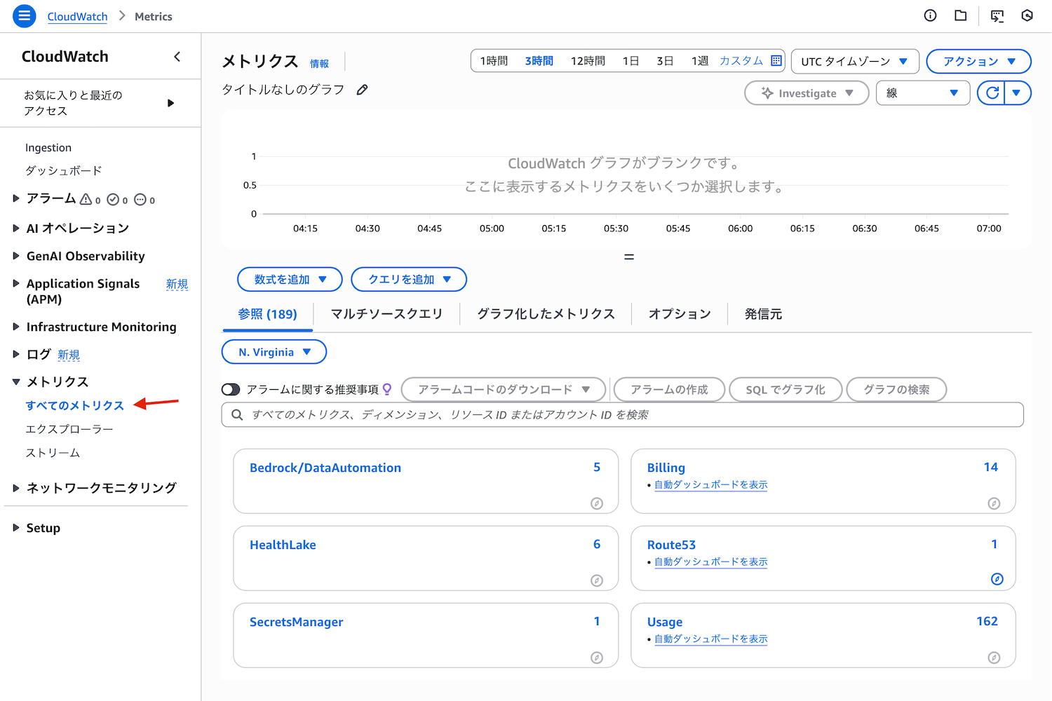 - AWSマネジメントコンソールでCloudWatchを開き、左側のメニューから「メトリクス」→「すべてのメトリクス」を選択します。