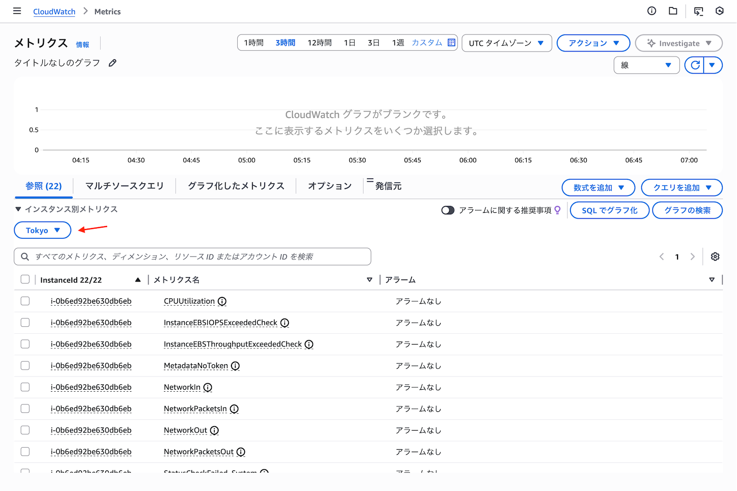 - 「EC2」→「インスタンス別メトリクス」を選択すると、EKSノードとして動作しているEC2インスタンスのメトリクスが表示されます。目的のメトリクスが表示されない場合は、リージョンが間違っているかもしれません。画像の赤矢印の部分のリージョンを確認してください。