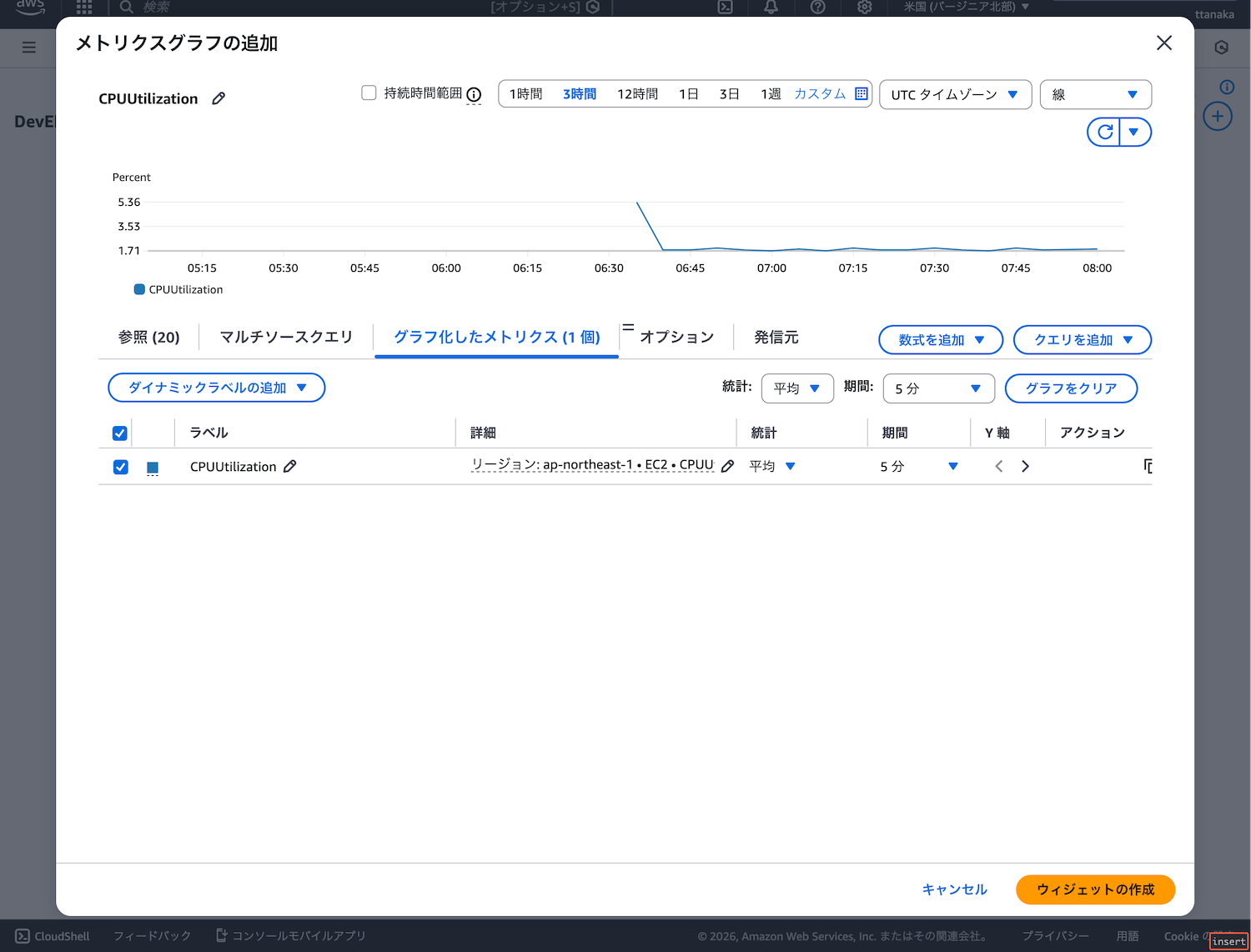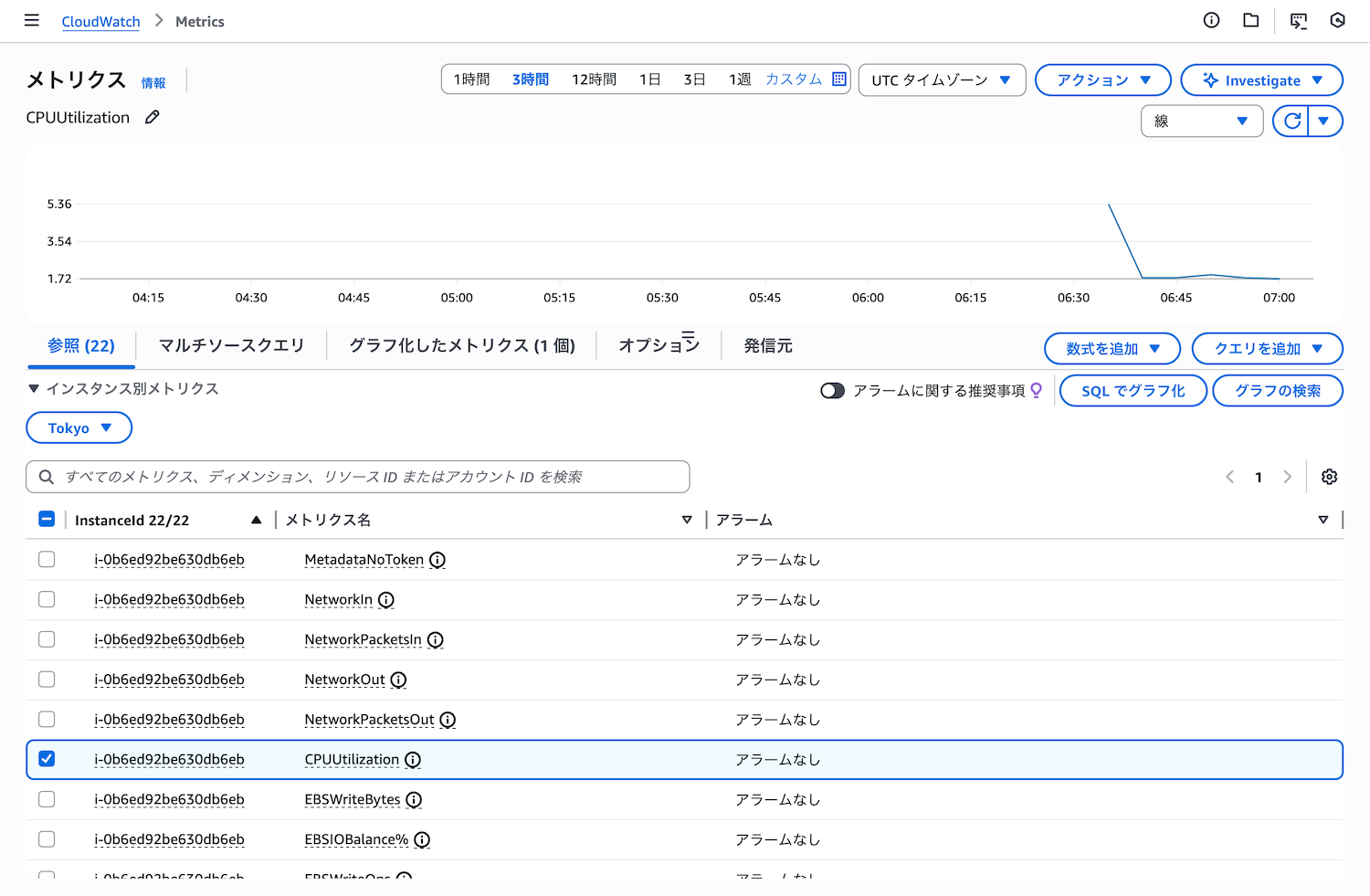 CPUUtilizationメトリクスを選択すると、過去の時間帯のCPU使用率がグラフで表示されます。デフォルトでは過去3時間のデータが表示されますが、期間を変更することで、過去1日、1週間、1か月などのデータも確認できます。