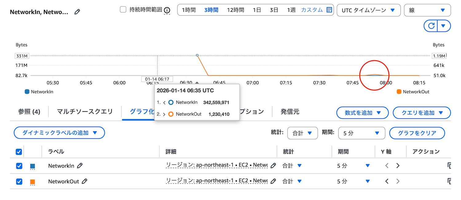 - NetworkOut: 送信ネットワークトラフィック(バイト)