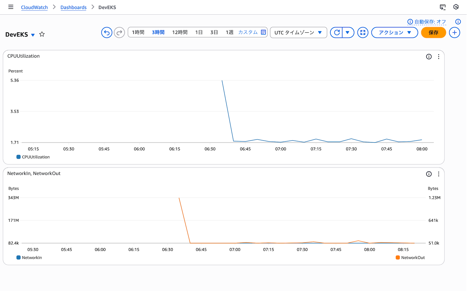 CloudWatchでEC2インスタンス(EKSノード)のメトリクスを収集し、CPU使用率やネットワークトラフィックを監視する方法を解説しました。CloudWatchダッシュボードを作成することで複数のメトリクスを1つの画面で可視化し、インフラの健全性を一目で確認できるようになりました。