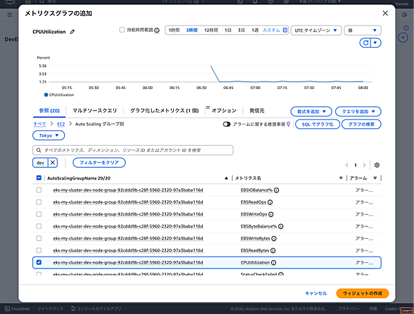 開発環境のAuto Scaling Group名には「dev」という文字が含まれているため、手順2でこれを検索しました。環境やリソースが増えると目的のメトリクスを探すのが大変なので、リソース名で絞り込むと良いでしょう。