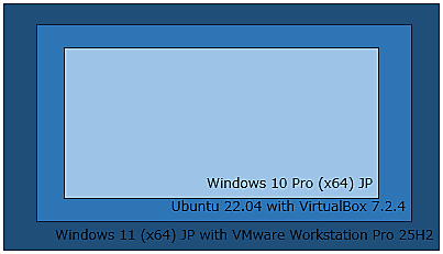 ベースOSである「Windows 11(x64) JP」に「VMware Workstation Pro for Windows」をインストールし、その上にHost OSとして「Ubuntu 22.04」を構築します。さらに、このUbuntu 22.04に「VirtualBox for Linux」をインストールし、その仮想環境上にGuest OSとして「Windows 10 Pro(x64) JP」を導入します。