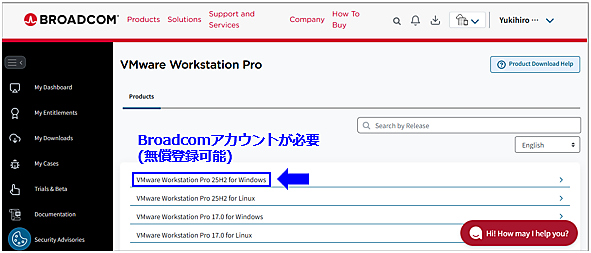 - VMware Workstation Pro for WindowsをBroadcom社の公式サイトからダウンロードします。ダウンロード先フォルダはどこでも構いませんが、ここでは「C:¥VM_share」フォルダに保存します。ダウンロードにはBroadcom社のアカウントが必要になります。画面右上の「LOGIN」プルダウンから無償でアカウント登録(REGISTER)可能です。