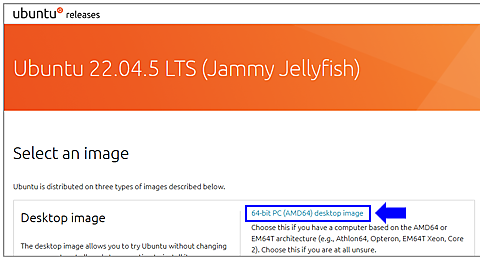 図3:Ubuntu 22.04 ダウンロード - Guest OSであるWindows10 (x64) JPをダウンロードします。すぐにISOファイルだけをダウンロードできないので、まず、ISOイメージダウンロード用のソフトウェア「MediaCreationTool_22H2.exe」をダウンロードします(図4)。ダウンロードしたexeファイルを実行後、[同意する]→[別のPCのインストールメディアを作成する(USBフラッシュドライブ、DVD、またはISOファイル)]→[次へ]→[ISOファイル]→ここでは「C:¥VM_share」フォルダに保存します。ファイル名は「win10x64jp.iso」とします。