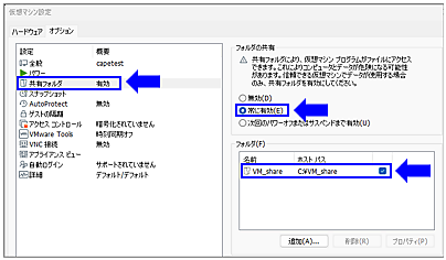 $ sudo apt install libxcb-cursor0 gcc make perl -y $ wget https://download.virtualbox.org/virtualbox/7.2.4/virtualbox-7.2_7.2.4-170995~Ubuntu~jammy_amd64.deb $ sudo dpkg -i virtualbox-7.2_7.2.4-170995~Ubuntu~jammy_amd64.deb - ベースOS(Windows 11)でVMware Workstation Pro for Windowsの仮想マシンのプロパティを変更([共有フォルダ]を有効)します(図8)。共有フォルダには、先に作成した「C:¥VM_share」を設定します。