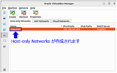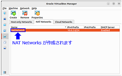 図10:Host-only Networks作成 - 続けて、VirtualBox for Linuxで[File]→[Tools]→[Network]→[NAT Networks]→[Create]を選択すると「NatNetwork」が作成されます(図11)。