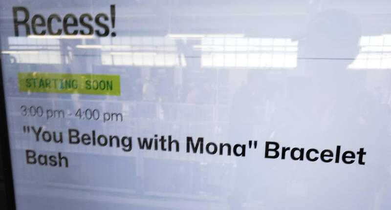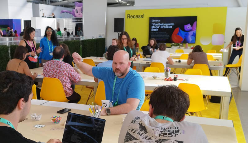 また去年のインタビューでは「GitHubのグッズとしてFriendship Braceletがあるといいんじゃない?」と提案をした記憶があるが、グッズとしては作られなかったが、自作コーナーであるRecess!のプログラムの中に「You belong with Mona」のブレスレットを作るプログラムが実施されており、好きな文字を組み込んだブレスレットを作る参加者でにぎわっていた。