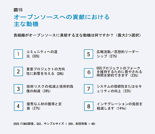 - 技術的負債の削減(28%): 自社独自の修正(パッチ)を本流(アップストリーム)に取り込んでもらうことで、将来的なメンテナンスコストを削減する