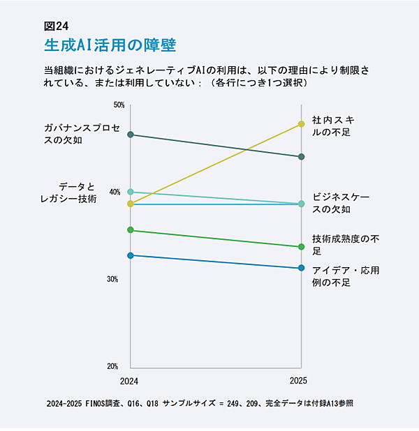 2024年の調査では、AI導入の最大の障壁は「ガバナンスプロセスの欠如」でしたが、2025年には「社内スキルの不足(46%)」がトップになりました。FINOSなどが策定した「AIガバナンスフレームワーク」により管理手法の整備は進みましたが、今度はそれを使いこなし、実装できるエンジニアの不足が深刻化しています。プロンプトエンジニアリングやデータエンジニアリングのスキル育成が急務となっています。