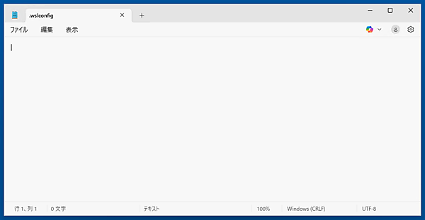 .wslconfig は、Windowsのユーザーフォルダ(%USERPROFILE%)の直下に作成するテキストファイルです。なおデフォルト状態では存在しないので、テキストエディタを使って新規に作成しましょう。今回はWindows標準のメモ帳を使い、空のファイルに以下の名前を付けて保存しました。