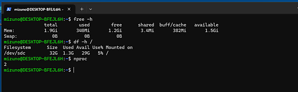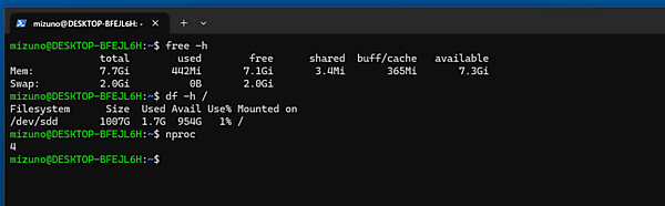 具体的な設定変更を行う前に、デフォルトの状態を確認しておきましょう。.wslconfigが空の状態でWSL2を起動し、「free」「df」「nproc」コマンドを実行した結果が下図です。この例では4コア・16GBメモリのマシンでWindowsを動かしているため、WSL2にはメモリの半分にあたる約7.7GiBが割り当てられています。スワップは、その25%(約 1.9GiB)を切り上げた2GiB が確保されています。