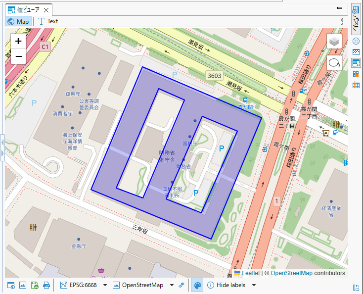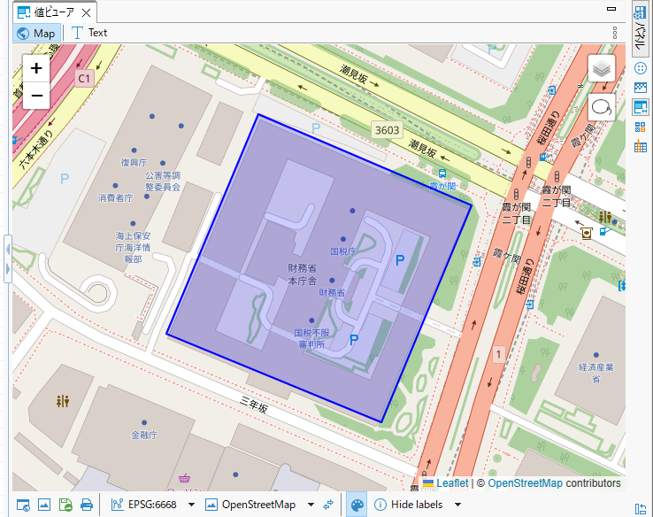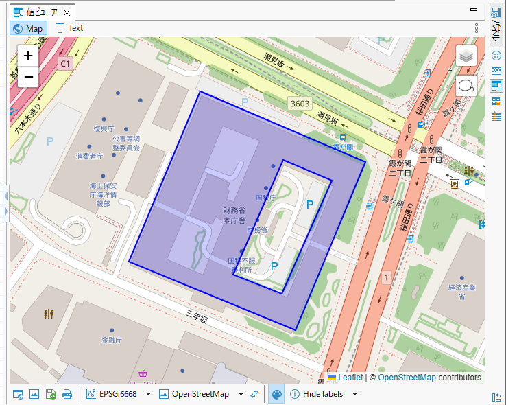 前回は千葉県の大まかな形を例に面データの扱い方を紹介しました。今回は打って変わって小さな単位、建物の形を題材にしようと思います。東京都千代田区にある財務省のビルを例にしましょう。