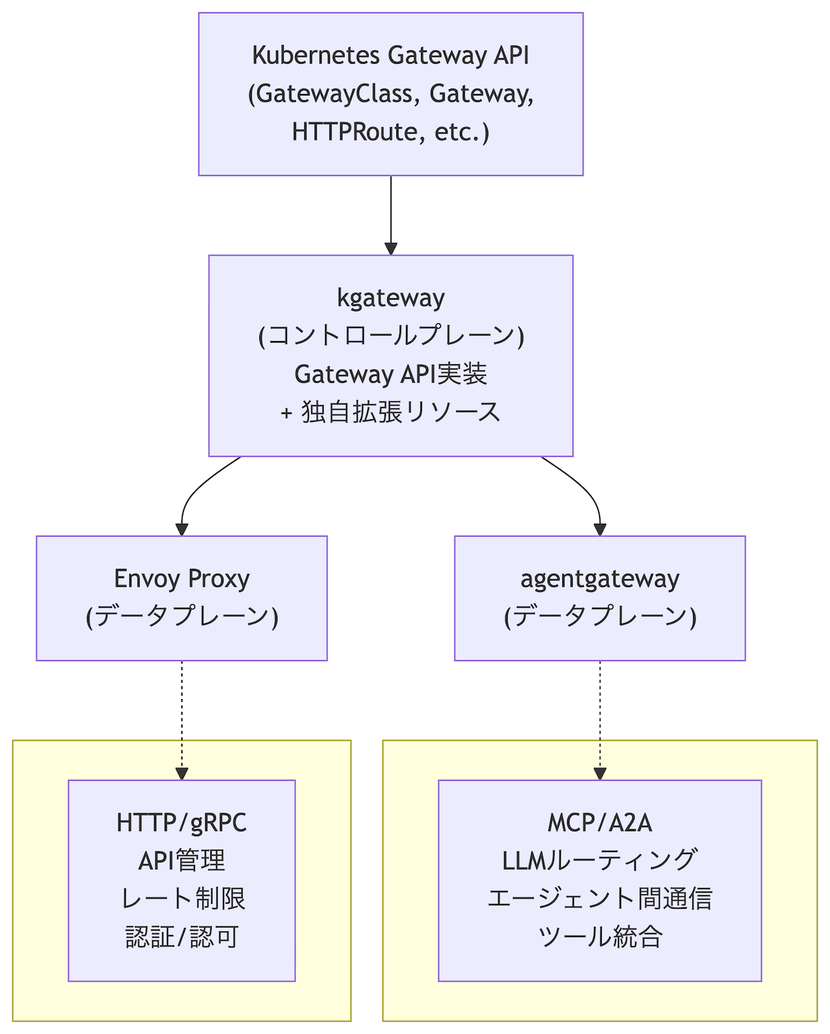 - kgateway+Envoy: 従来のHTTP/gRPCルーティング、API管理、WAF、サービスメッシュ統合