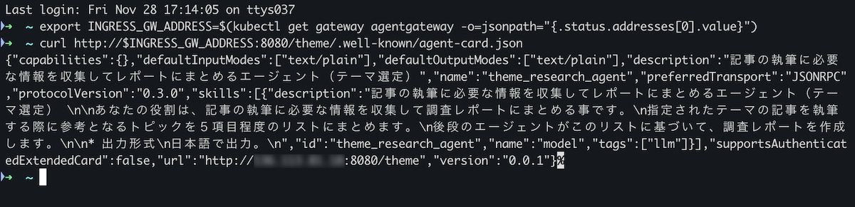 kubectl apply -f agents-k8s.yamlエージェントカードを取得してみます。