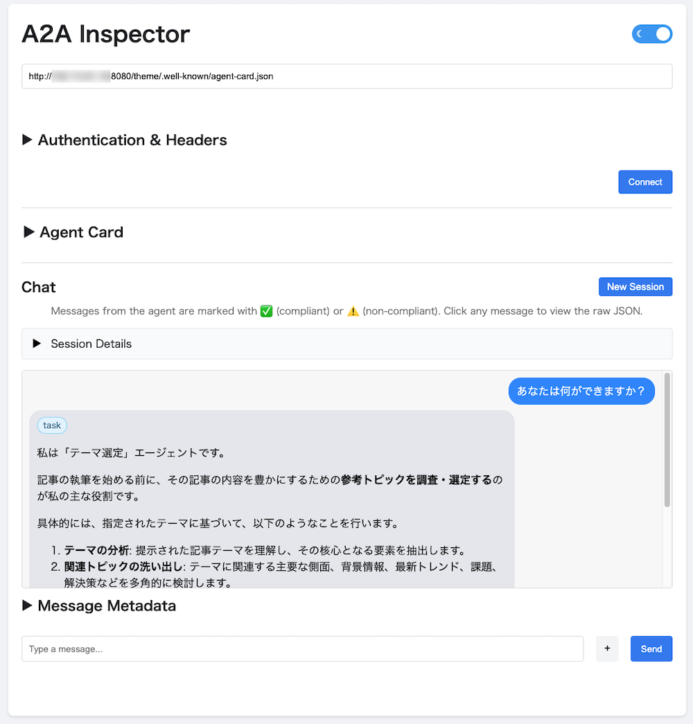 curl http://$INGRESS_GW_ADDRESS:8080/theme/.well-known/agent-card.jsonこのエージェントを利用してみます。検証にはa2a-inspectorを利用しました。下図のように応答が取得できます。