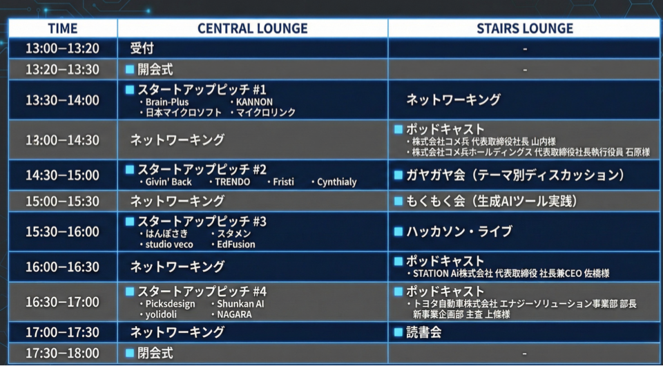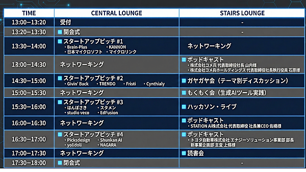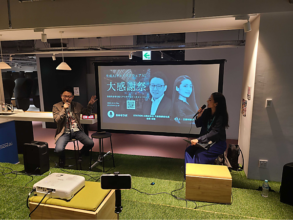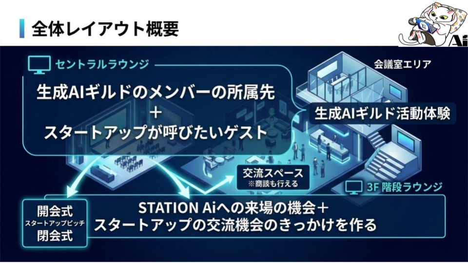 「生成AIギルドのメンバーの所属先」や「スタートアップが呼びたいゲスト」を招待し、会場は2箇所で実施。STATION Aiの3階セントラルラウンジでは、開会式、閉会式、スタートアップピッチを。3階の階段ラウンジでは、生成AIギルドの活動体験と、ビジネスの最前線者たちのAIの使い方や考え方をポッドキャストで発信した。