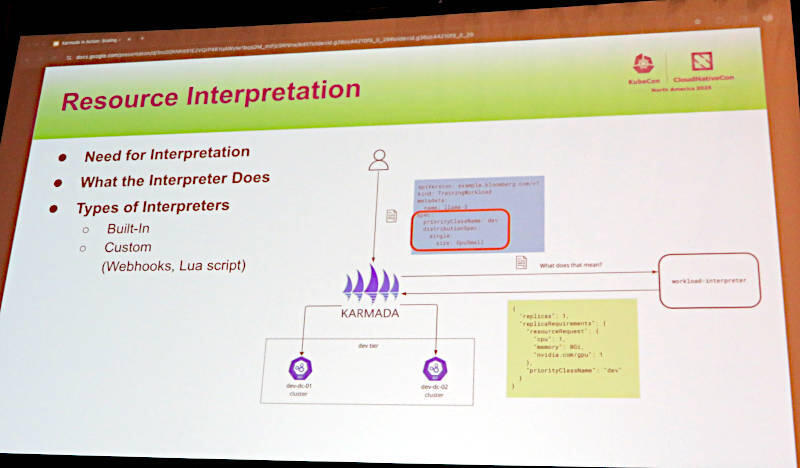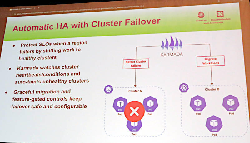 このスライドではKarmadaの特徴を紹介しているが、Kubernetesをマルチクラスター環境でスケジューリングしたいというニーズに合わせて開発されているため、なるべくKubernetesの作法に合わせて使えるように設計されているところがポイントだろう。複数のKubernetesクラスターを束ねる中央に位置するコントローラー自体がKubernetesで実装されている。デベロッパーはカスタムリソースを使って必要とするリソースを定義し、それをインタープリターと呼ばれる変換メカニズムを使って配下のKubernetesのリソースに変換した上で、Podのスケジューリングを行うというのが主なメカニズムだ。当然、クラスターの状態を常に監視するヘルスチェックが実装され、それによって高可用性が実現できていることが後半に解説される。